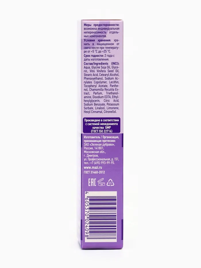 Состав: Aqua, Glycine Soja Oil (масло соевое), Glycerin, Vitis Vinifera Seed Oil (масло виноградной косточки), Stearic Acid, Cetearyl Alcohol, Phenoxyethanol, Sodium Acrylates Copolymer, Lecithin, Tocopheryl Acetate (витамин Е), Panthenol (Д-пантенол), Chamomilla Recutita Extract