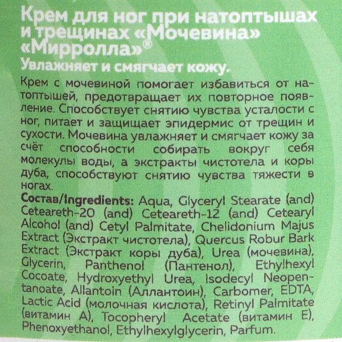 Мочевина увлажняет и смягчает кожу за счёт способности собирать вокруг себя молекулы воды, а экстракты чистотела и коры дуба, способствуют снятию чувства тяжести в ногах.