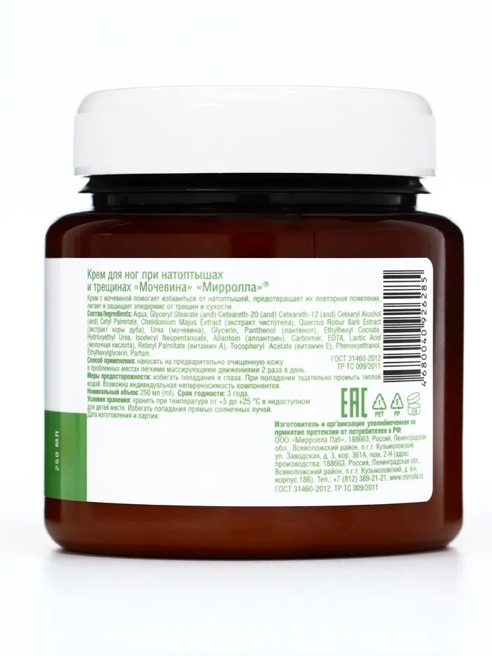 Состав: Aqua, Glyceryl Stearate (and) Ceteareth-20 (and) Ceteareth-12 (and) Cetearyl Alcohol (and) Cetyl Palmitate, Chelidonium Majus Extract (Экстракт чистотела), Quercus Robur Bark Extract (Экстракт коры дуба), Urea (мочевина), Glycerin, Panthenol (Пантенол), Ethylhexyl Cocoate, Hydroxyethyl Urea, Isodecyl Neopentanoate, Allantoin (Аллантоин), Carbomer, EDTA, Lactic Acid (молочная кислота), Retinyl Palmitate (витамин А), Tocopheryl Acetate (витамин Е), Phenoxyethanol, Ethylhexylglycerin, Parfum.