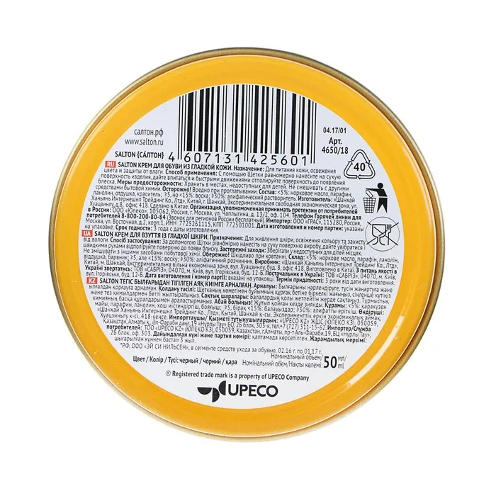 Благодаря инновационной Технологии All-Day-Effect Крем для обуви SALTON поддерживает ухоженный вид обуви в течение всего дня: предотвращает появление мелких трещин, восстанавливает цвет, придает интенсивный блеск после полировки, обладая водоотталкивающими свойствами.