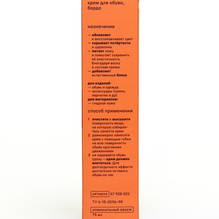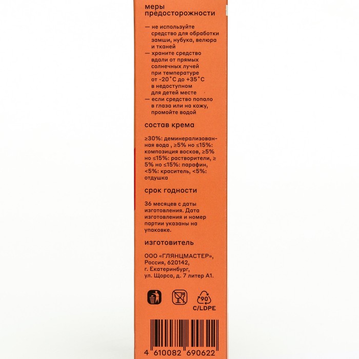 Способ применения: с помощью губки нанести крем на чистую и сухую поверхность обуви. Дать впитаться, отполировать.