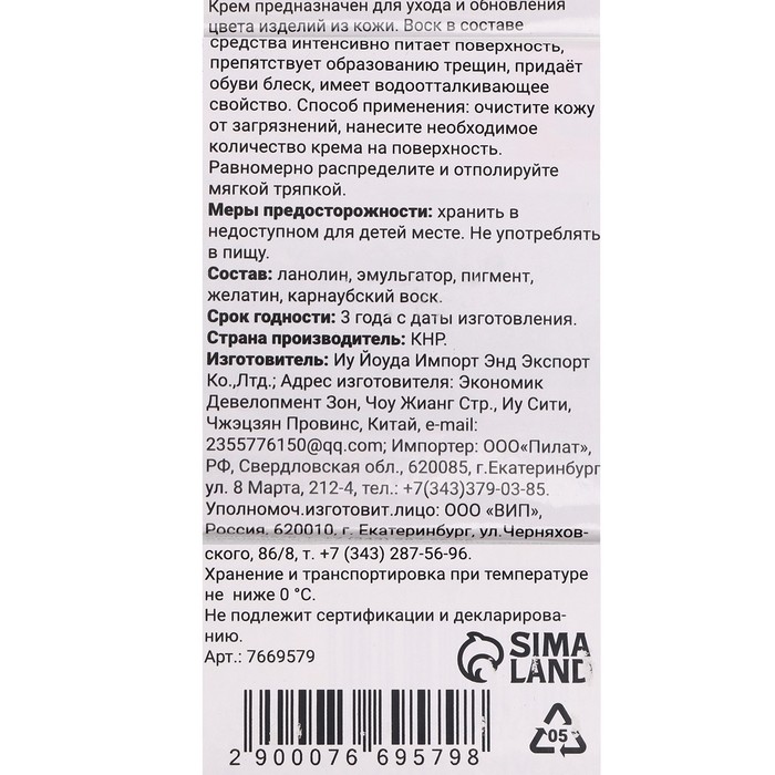 Обеспечивает надёжный уход за обувью, защиту и блеск любой гладкой коже. Питает и защищает чувствительную кожу от влаги и повторного загрязнения. Обновляет цвет с помощью высококачественных, стойких пигментов. Создает эффект новизны, закрашивает потертости и царапины, питает, сохраняет кожу мягкой и эластичной. Сохраняет стойкий блеск и надежно защищает обувь от влаги, соли и снега.