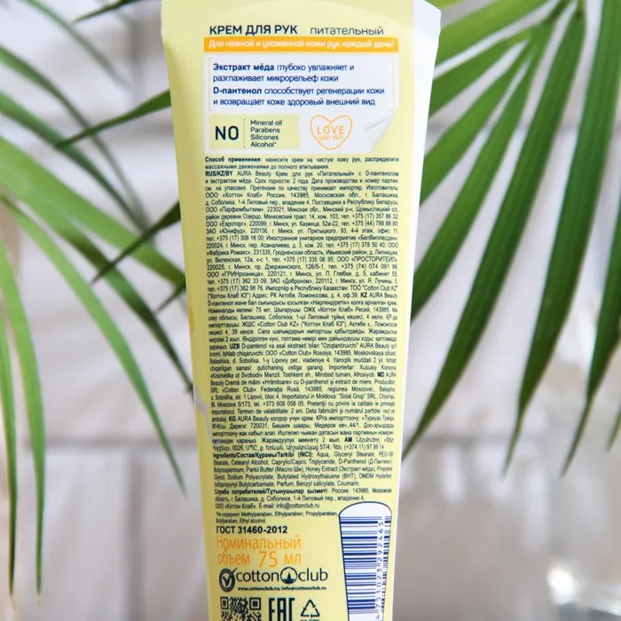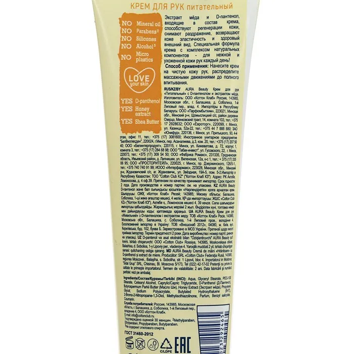 Состав: Aqua, Glyceryl Stearate, PEG-100 Stearate, Cetearyl Alcohol, Caprylic/Capric Triglyceride, D-Panthenol (Д-Пантенол), Butyrospermum Parkii Butter (Масло Ши), Honey Extract (Экстракт мёда), Propylene Glycol, Sodium Polyacrylate, Butylated Hydroxythaluene (BHT), 2-Bromo-2-Nitropropane-1,3-Diol, Methylisothiazolinone, Parfum, Benzyl salicylate, Coumarin.