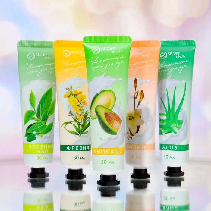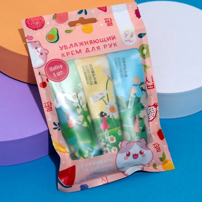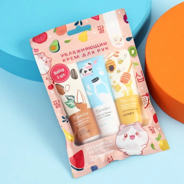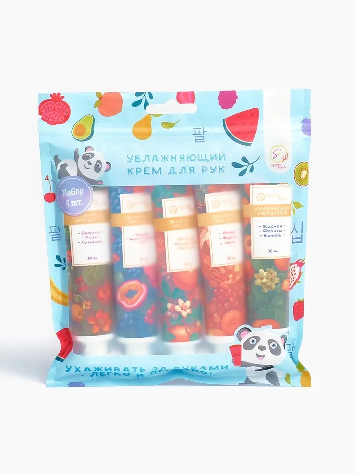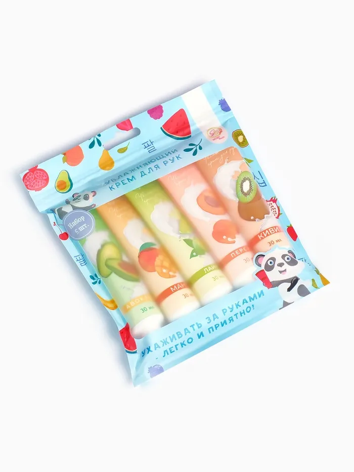 В набор входят увлажняющие крема: Крем для рук «Кокос» 30 мл, Крем для рук «Персик» 30 мл, Крем для рук «Клубника» 30 мл, Крем для рук «Манго» 30 мл, Крем для рук «Виноград» 30 мл.
