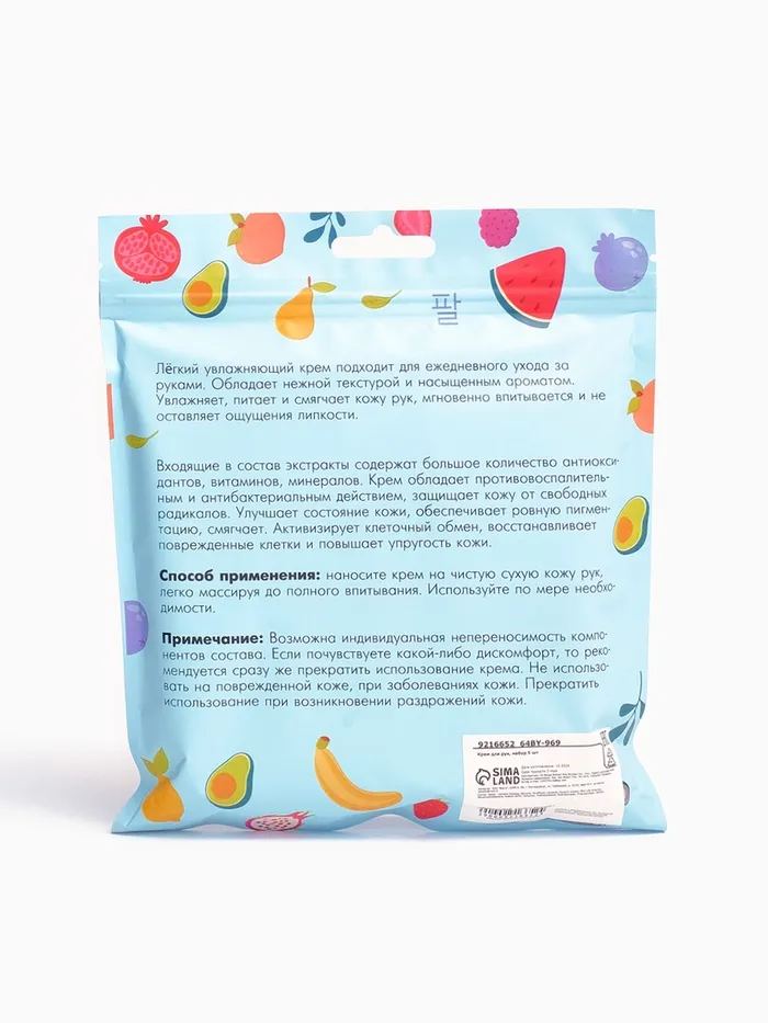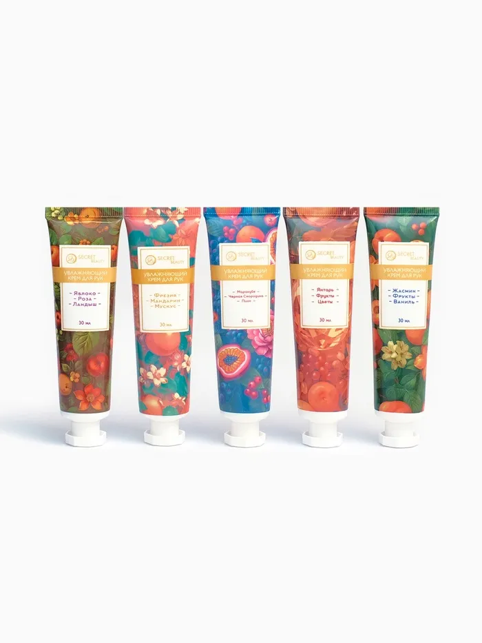 В набор входят увлажняющие крема: Крем для рук «Маракуя, чёрная смородина, пион» 30 мл, Крем для рук «Жасмин, фрукты, ваниль» 30 мл, Крем для рук «Фрезия, мандарин, мускус» 30 мл, Крем для рук «Яблоко, роза, ландыш» 30 мл, Крем для рук «Цветы, фрукты, янтарь» 30 мл.