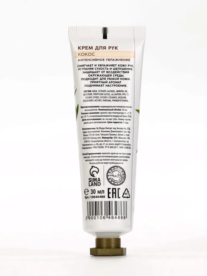 Крем для рук, интенсивное увлажнение, аромат кокоса, 30 мл, URAL LAB — Характеристики