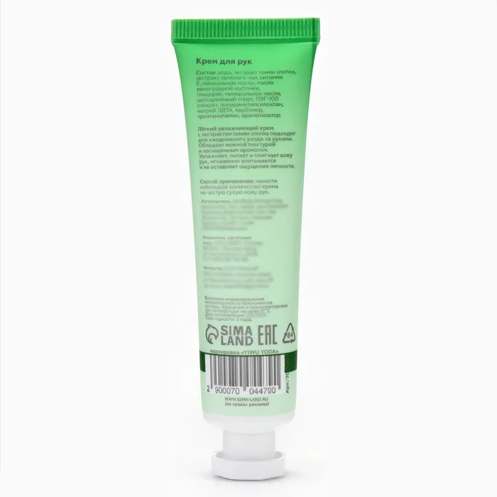 Состав: вода, экстракт зеленого чая, глицерин, минеральное масло, цетеариловый спирт, ПЭГ-100 стеарат, полидиметилсилоксан, натрий ЭДТА, карбомер, триэтаноламин, метилпарабен, пропилпарабен, ароматизатор хлопка.