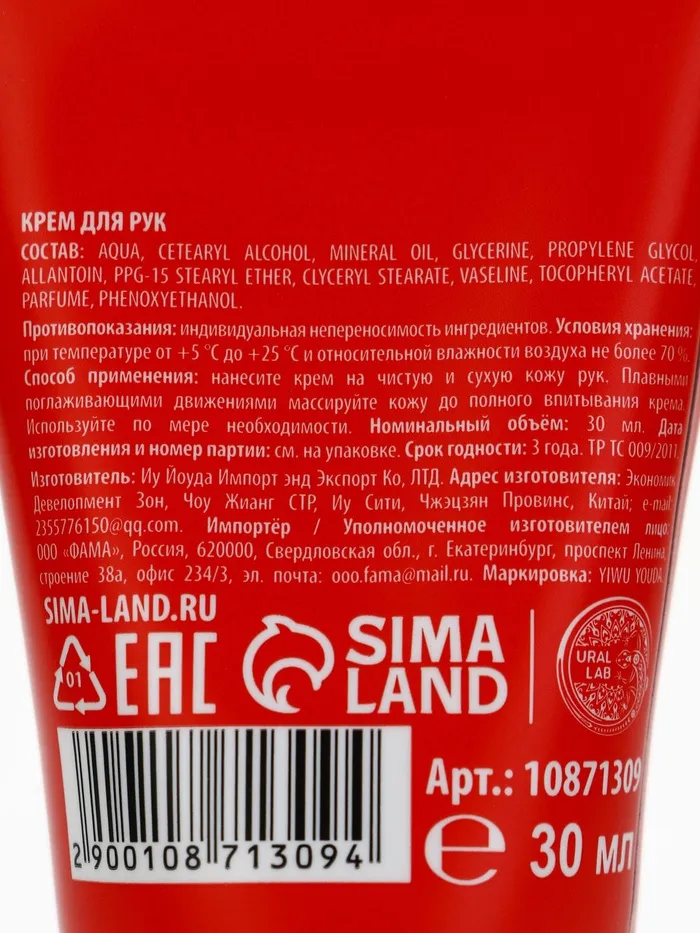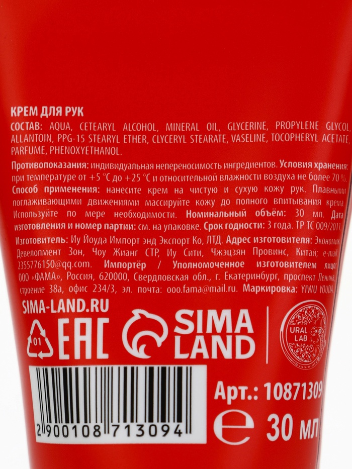 Крем для рук новогодний Hello, winter, с ароматом горячего шоколада, 30 мл, URAL LAB — Характеристики