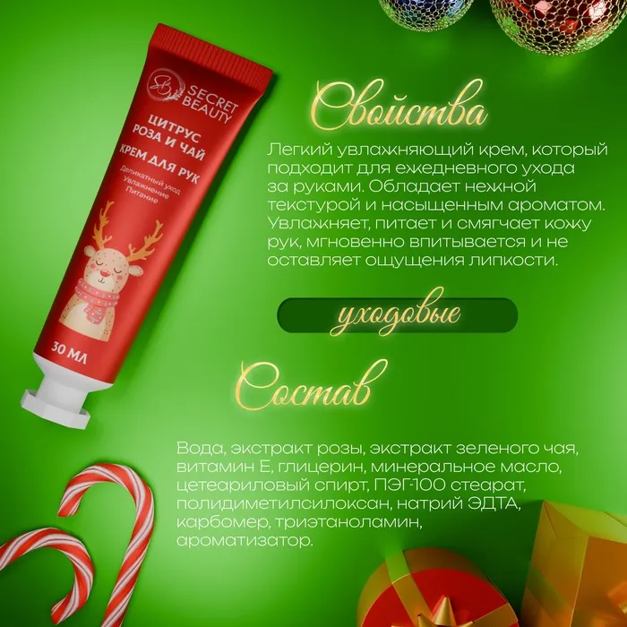 Крем для рук новогодний «Цитрус, роза и чай», 30 мл — это идеальный новогодний подарок для ваших близких, который подарит не только заботу о коже, но и новогоднее настроение. Легкая текстура крема быстро впитывается, увлажняя и питая кожу рук, оставляя её мягкой и бархатистой. Уникальная комбинация ароматов цитруса, розы и чая создаст атмосферу праздника и комфорта в любой день зимы.