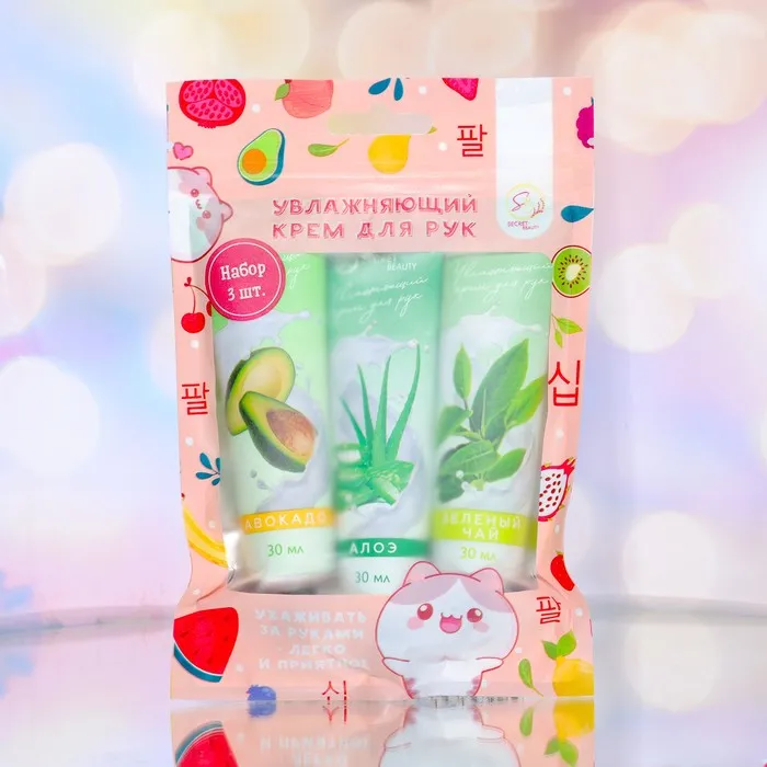 В набор входят увлажняющие крема: Крем для рук с экстрактом Алоэ Вера 30 мл, Крем для рук с экстрактом Авокадо 30 мл, Крем для рук с прополисом 30 мл.