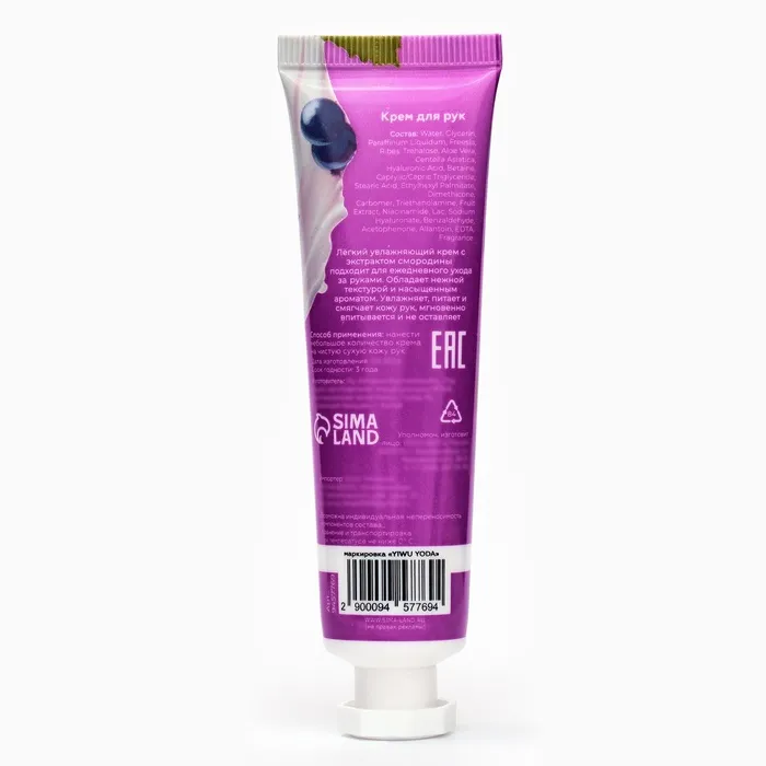 Состав: вода, экстракт смородины, гиалуронат натрия, глицерил стеарат, глицерин, пропиленгликоль, минеральное масло, вазелин, бисаболол, феноксиэтанол, гидролизованное касторовое масло, ароматизатор.