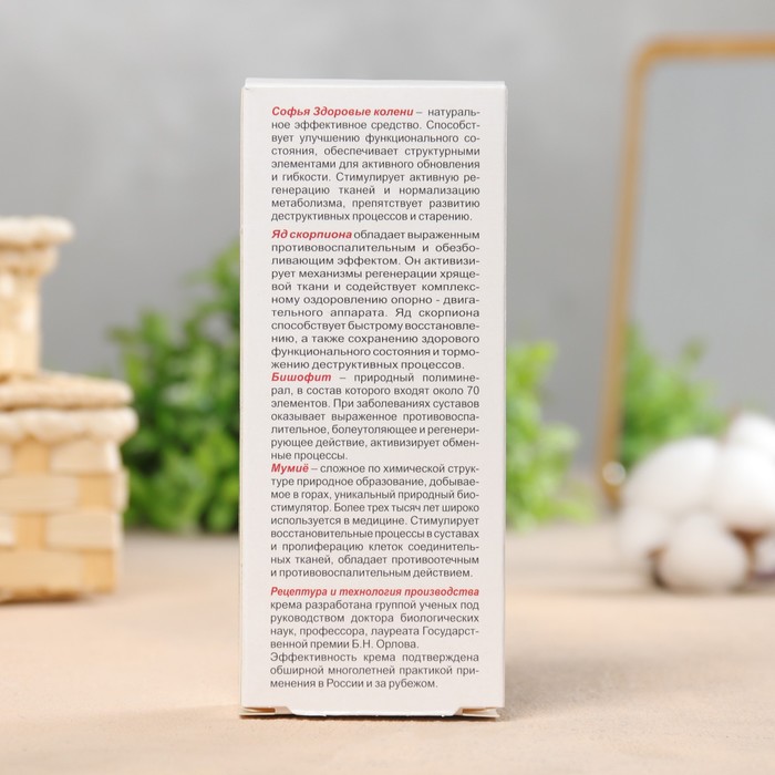 Эффективность крема обеспечена высокой биологической активностью и синергизмом его натуральных компонентов, оказывающих глубокое комплексное действие в области коленей.
