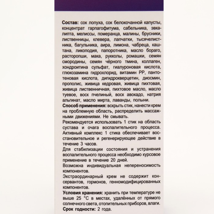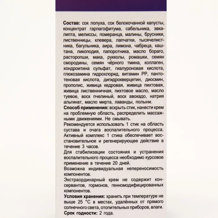 Экстраординарный крем на основе активизированных хондроитиновых липосом в биогенной среде коллагена и гиалуроновой кислоты, обладает проникновением к клеточному матриксу суставной сумки и околосуставной соединительной ткани, избирательно высвобождает активные хондропротекторы в очаге воспалительного процесса, способствует: