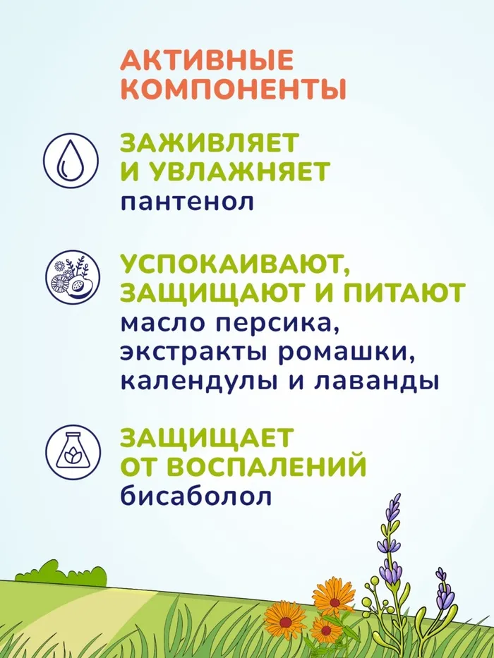 Натуральное масло персика в комплексе с экстрактами трав обеспечивает питание, смягчение и способствует удержанию влаги. Природный бисаболол успокаивает раздраженную кожу и оказывает регенерирующее действие.