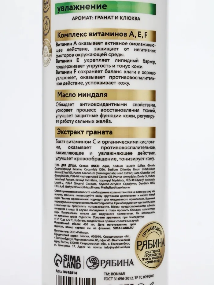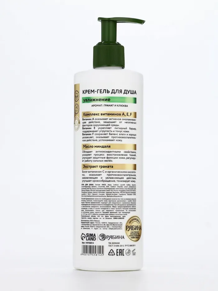 Крем-гель для душа «Гранат и клюква», нежнось и увлажнение, 400 мл, BONAMI — Характеристики