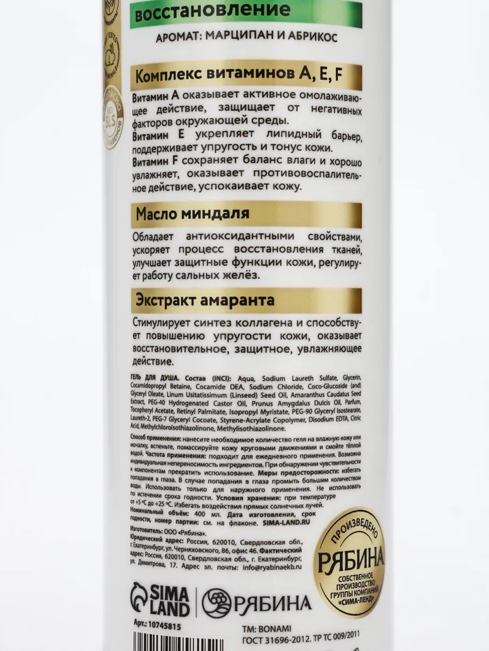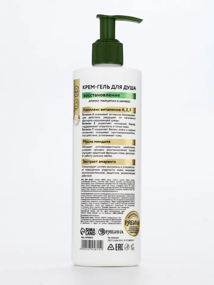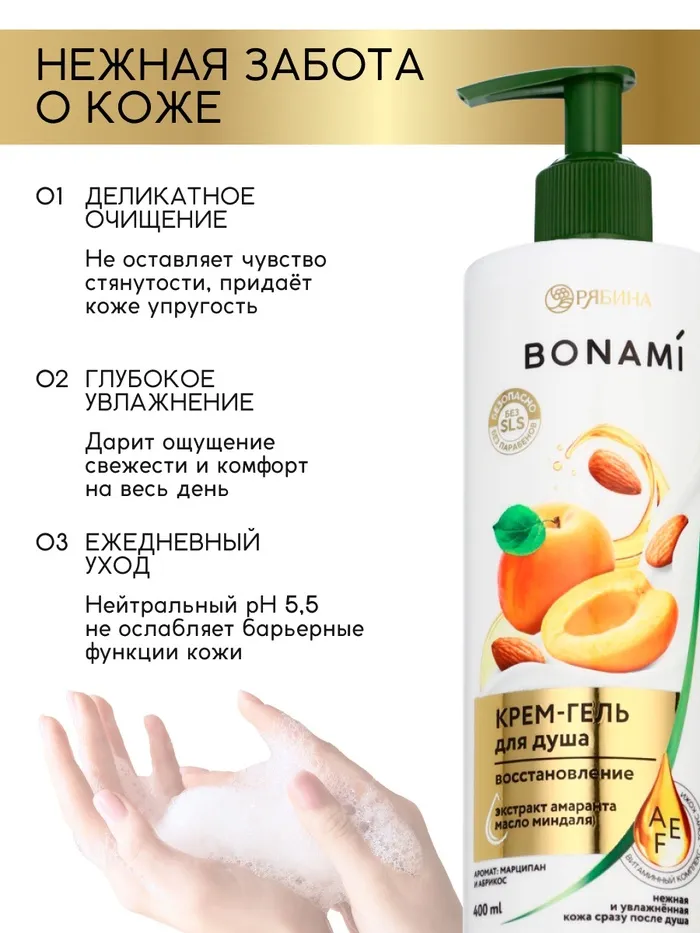 Крем-гель для душа «Марципан и абрикос», нежнось и увлажнение, 400 мл, BONAMI — Характеристики