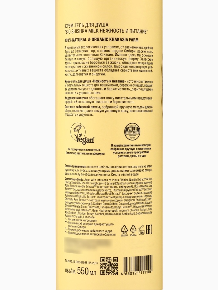 В основе крем-геля — натуральное сибирское молочко шишки, известное своими питательными и успокаивающими свойствами. Оно заботится о коже, поддерживает её естественный баланс и дарит мягкость с первого применения.