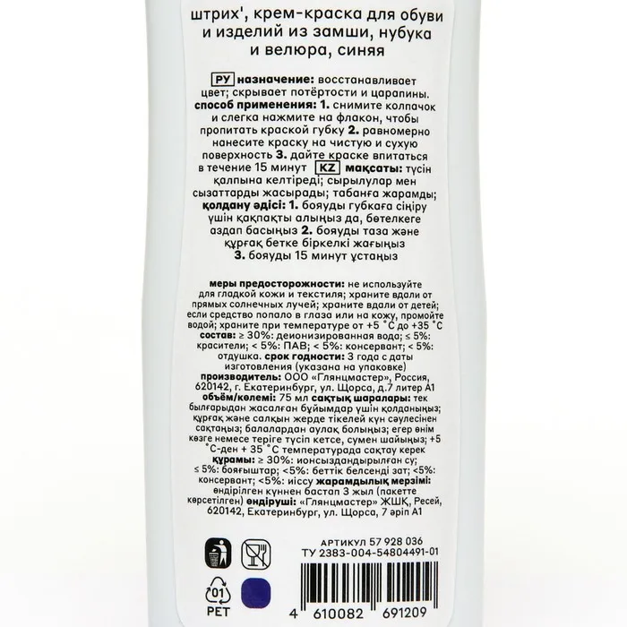 Способ применения: 1. снимите колпачок и слегка нажмите на флакон, чтобы пропитать краской губку
