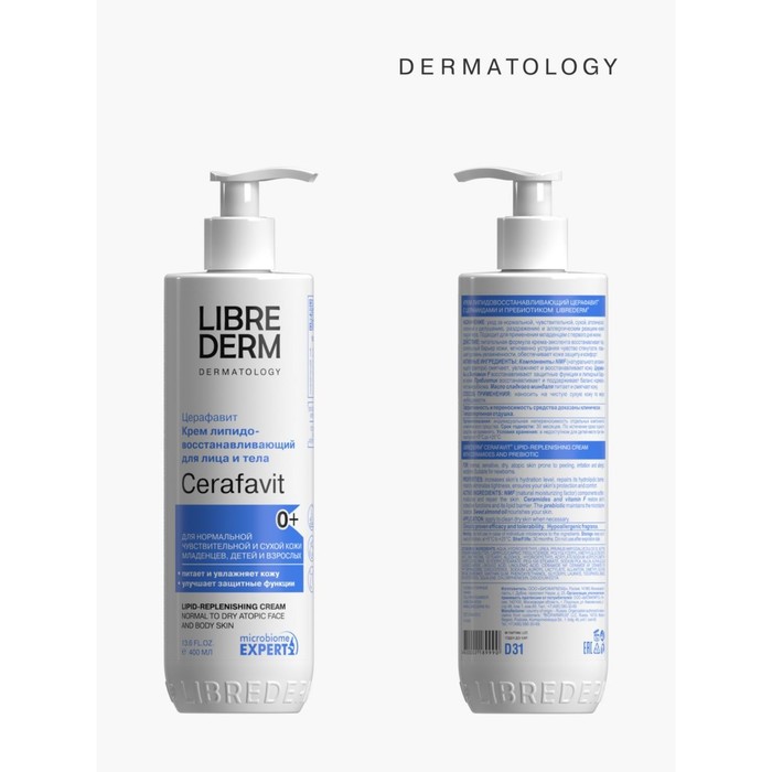 Крем липидовосстанавливающий ЦЕРАФАВИТ/CERAFAVIT нормализует функции сухой, чувствительной и атопической кожи взрослых и детей с первых дней жизни 0+. Уникальная формула из чистого Витамина F, церамидов и пребиотика способствует быстрому восстановлению гидролипидного барьера кожи и синтезу собственных церамидов. Эффективен при раздражениях, шелушении, покраснении и зуде. Быстро снимает ощущение сухости и стянутости, повышает иммунитет кожи. Удерживает влагу в коже и увеличивает её эластичность. Нежный крем быстро впитывается, питает и увлажняет кожу. Не содержит парабенов и красителей. СПОСОБ ПРИМЕНЕНИЯ: наносить на чистую сухую кожу после душа.