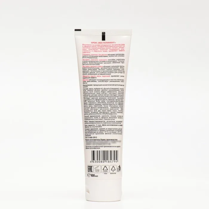 Крем "Мастолимфит" изготовлен на основе натуральных экстрактов трав и эфирных масел, которые благоприятно влияют на состояние тканей молочных желез, питают, увлажняют, тонизируют, помогают поддержать эластичность и упругость кожи, проявляют эффект лифтинга.