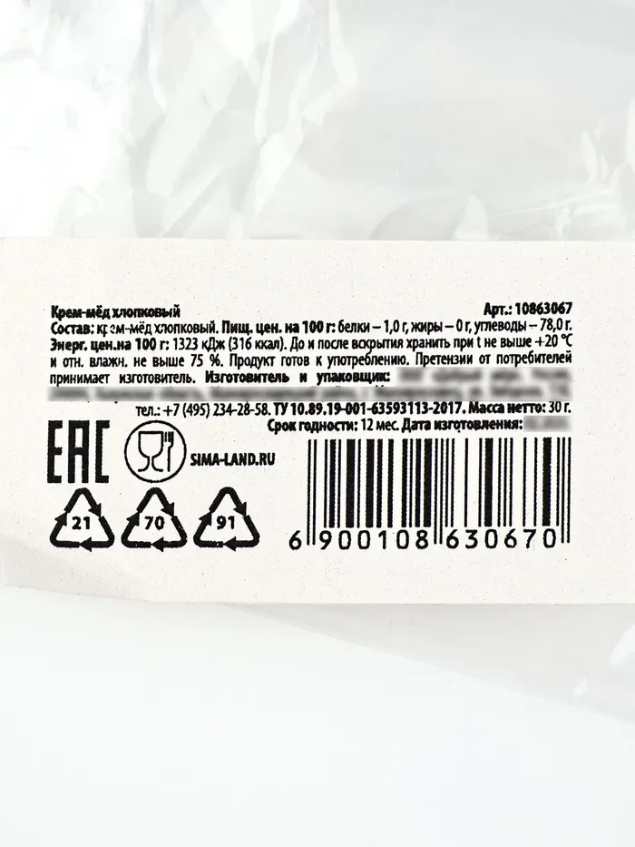 Состав: крем-мёд хлопковый.