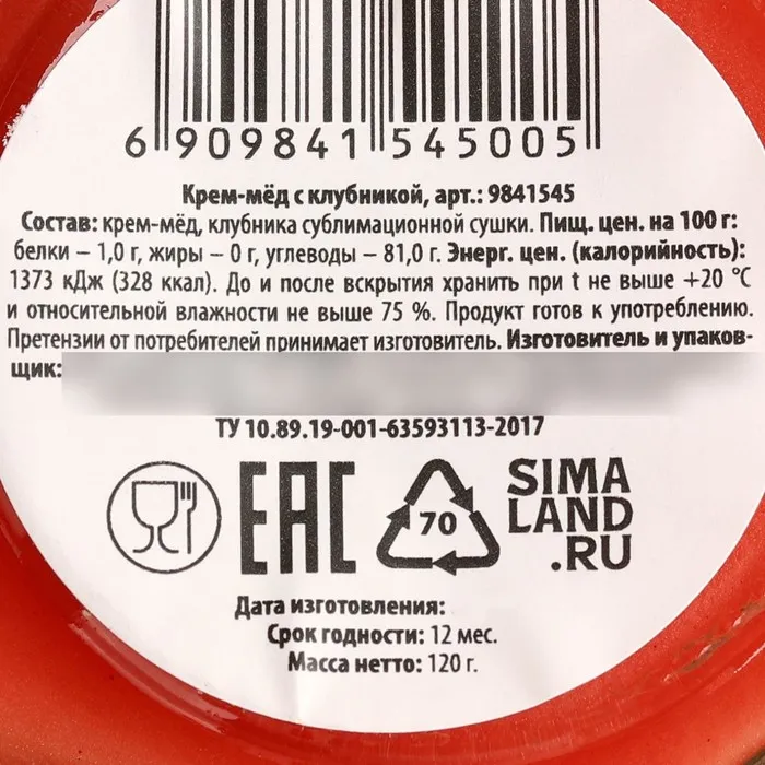 Крем - мёд, со вкусом клубники, 120 г. — Характеристики