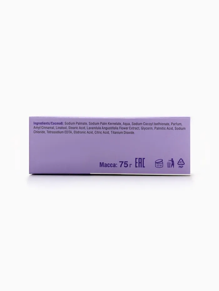 Состав: Sodium Palmate, Sodium Palm Kernelate, Aqua, Sodium Cocoyl Isethionate, Parfum, Amyl Cinnamal, Linalool, Stearic Acid, Lavandula Angustifolia Flower Extract, Glycerin, Palmitic Acid, Sodium Chloride, Tetrasodium EDTA, Etidronic Acid, Citric Acid, Titanium Dioxide.