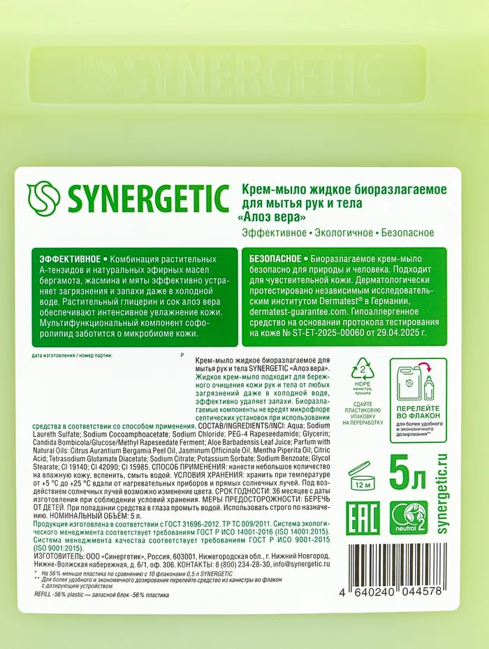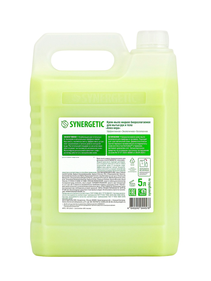 Крем-мыло SYNERGETIC "Алоэ вера" — это экологичное средство для бережного ухода за кожей рук и тела. Формула на основе растительных компонентов эффективно очищает, не пересушивая и сохраняя естественный баланс влаги. Экстракт алоэ вера интенсивно увлажняет, смягчает и успокаивает кожу, придавая ей ощущение свежести и комфорта после каждого применения.