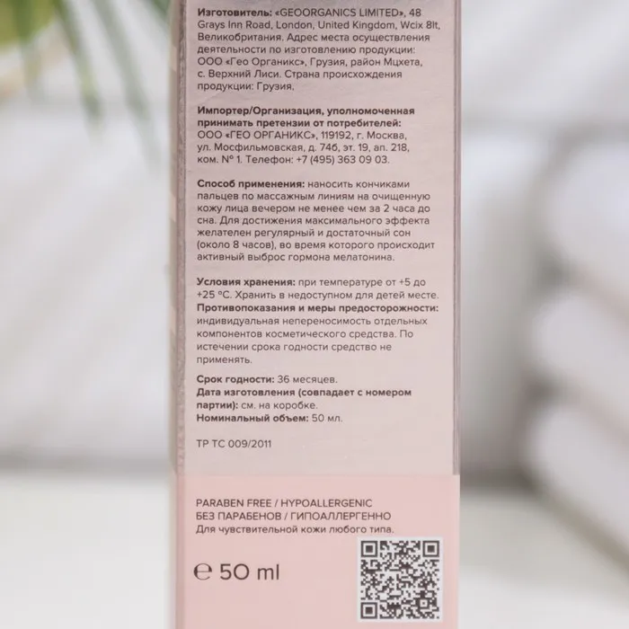Способ применения: наносить кончиками пальцев по массажным линиям на очищенную кожу лица вечером не менее чем за 2 часа до сна. Для достижения максимального эффекта желателен регулярный и достаточный сон (около 8 часов), во время которого происходит активный выброс гормона мелатонина.