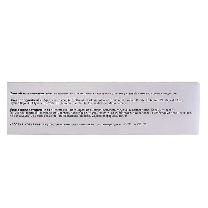Способ применения: нанести крем-пасту тонким слоем на чистую и сухую кожу ступней и межпальцевые складки ног.