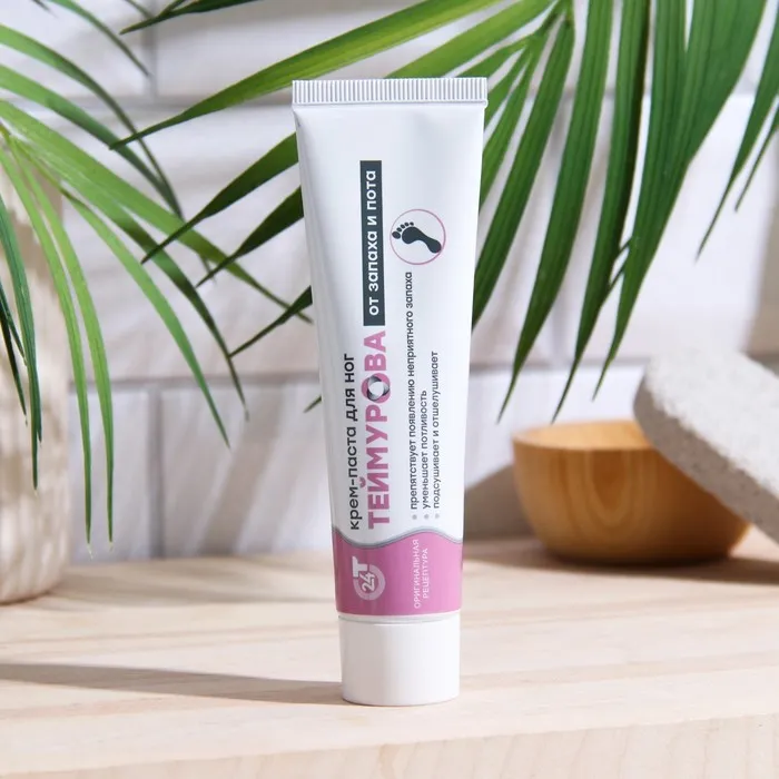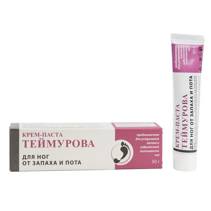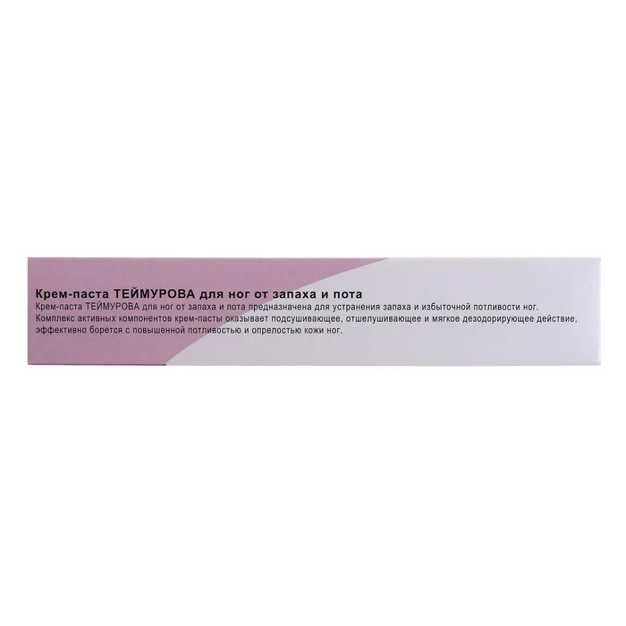 Крем-паста ТЕЙМУРОВА для ног от запаха и пота предназначена для устранения запаха и избыточной потливости ног. Комплекс активных компонентов крем-пасты оказывает подсушивающее, отшелушивающее и мягкое дезодорирующее действие, эффективно борется с повышенной потливостью и опрелостью кожи ног.