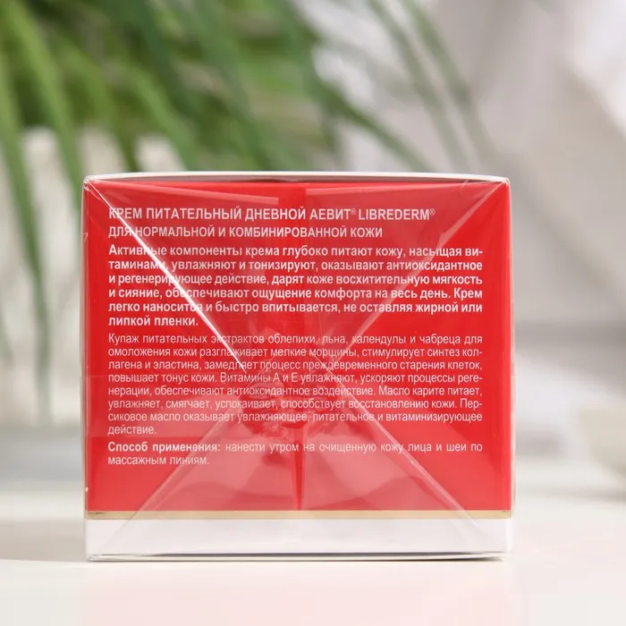 LIBREDERM АЕВИТ крем питательный дневной 50 мл. Крем питательный дневной АЕВИТ глубоко питает кожу, насыщая витаминами, увлажняет и тонизирует, оказывает антиоксидантное и регенерирующее действие, дарит коже восхитительную мягкость и сияние. Легко наносится и быстро впитывается, не оставляя жирной или липкой пленки. Подходит для нормальной и комбинированной кожи. Купаж питательных экстрактов облепихи, льна, календулы и чабреца для омоложения кожи разглаживает мелкие морщины, стимулирует синтез коллагена и эластина, замедляет процесс преждевременного старения клеток, повышает тонус кожи. Витамины А и Е эффективно увлажняют, ускоряют процессы регенерации, обеспечивают антиоксидантное воздействие. Масло карите питает, увлажняет, смягчает, успокаивает, защищает кожу, способствует ее восстановлению. Персиковое масло оказывает увлажняющее, питательное и витаминизирующее действие. СПОСОБ ПРИМЕНЕНИЯ: нанести утром на очищенную кожу лица и шеи по массажным линиям.