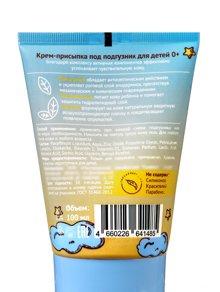 Состав: Paraffinum Liquidum, Aqua, Zinc Oxide, Propylene Glycol, Petrolatum, Lanolin, Ozokerite, Steareth-2, Steareth-21, Beeswax, Parfum, Lactic Acid, Benzoic Acid, Sorbic Acid, Glycerin, Benzyl Alcohol.