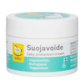 Защитный крем Ainu Suojavoide лечит и успокаивает чувствительную кожу новорожденного в области подгузников. Он универсален для ухода за кожей любой области. Без запаха, бесцветный. Биоразлагаемый и веганский состав.