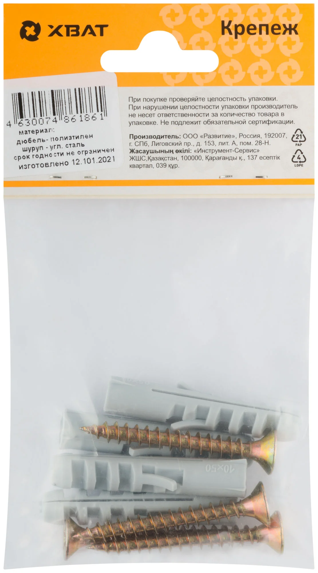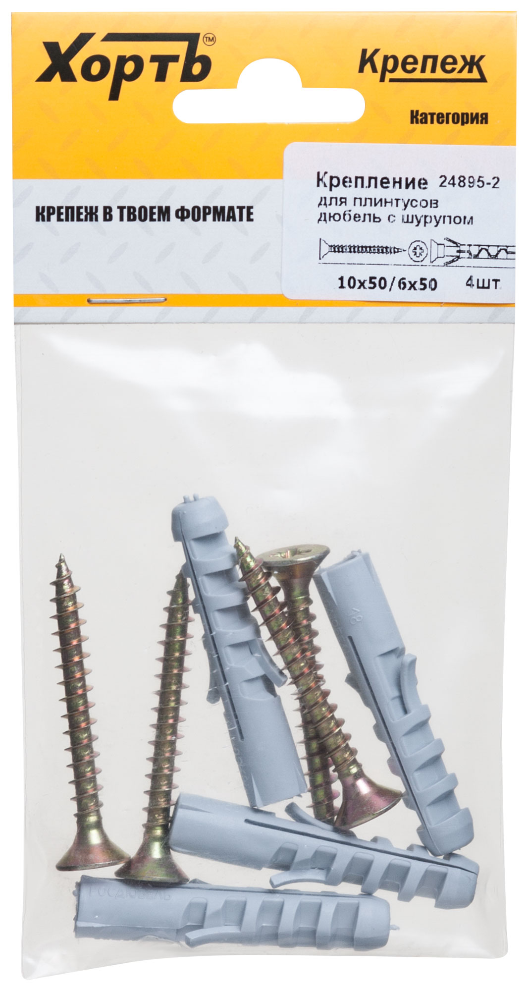 Каждый дюбель изготовлен из прочного полипропилена, что обеспечивает долгий срок службы, а шуруп из стали гарантирует надежную фиксацию элементов. Комплект включает четыре дюбеля и шурупа, что делает его удобным для небольших объемов работ.