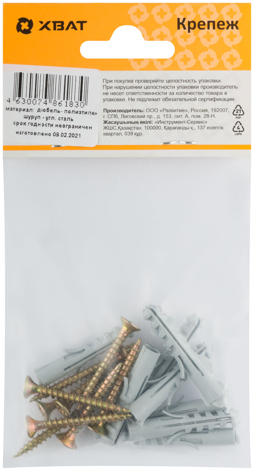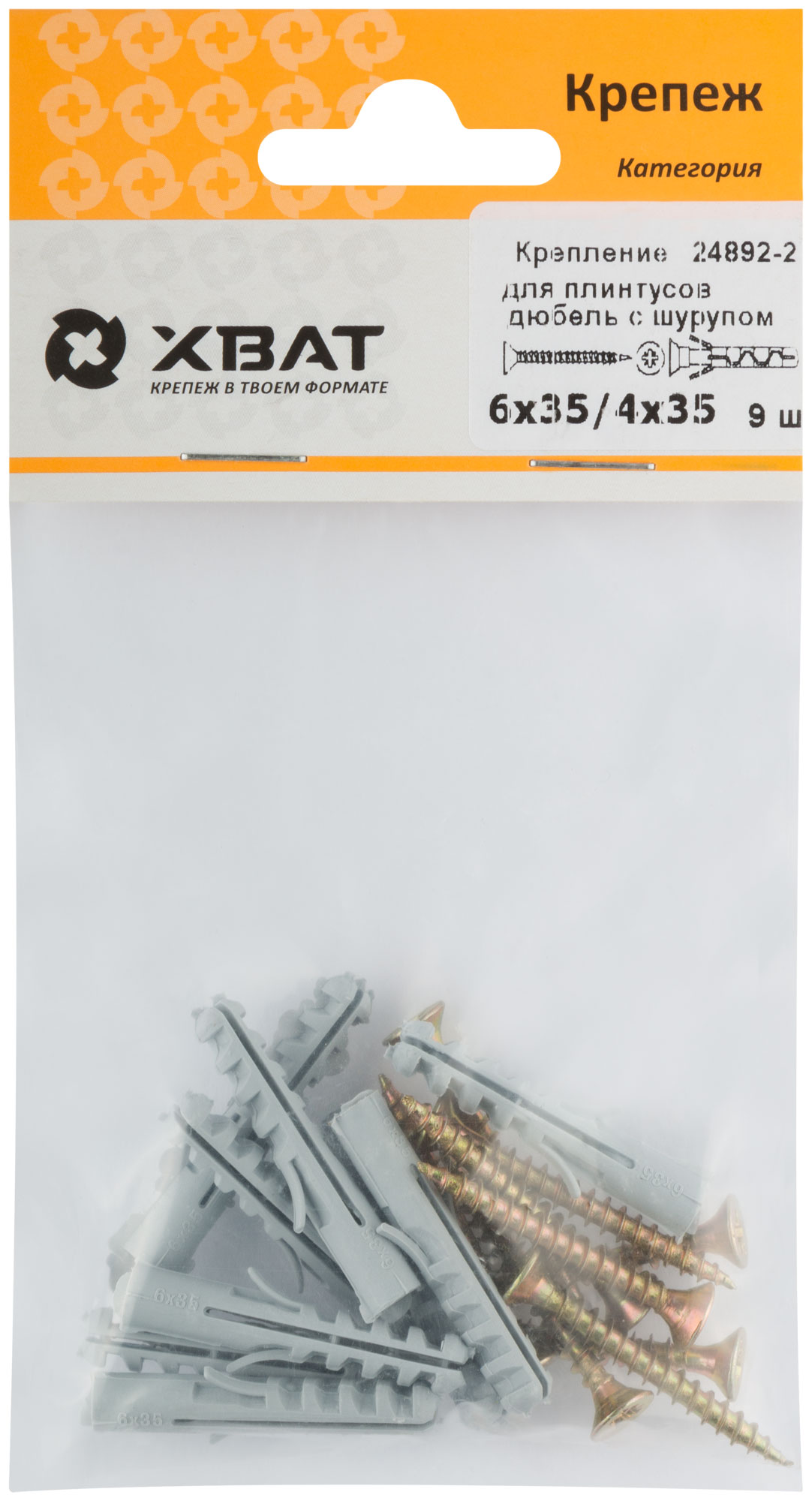 Дюбель изготовлен из полипропилена, что обеспечивает долговечность и надежность крепления. Шуруп выполнен из стали, что гарантирует прочную и надежную фиксацию конструкции. Комплект включает 9 наборов, что удобно для небольших монтажных работ.
