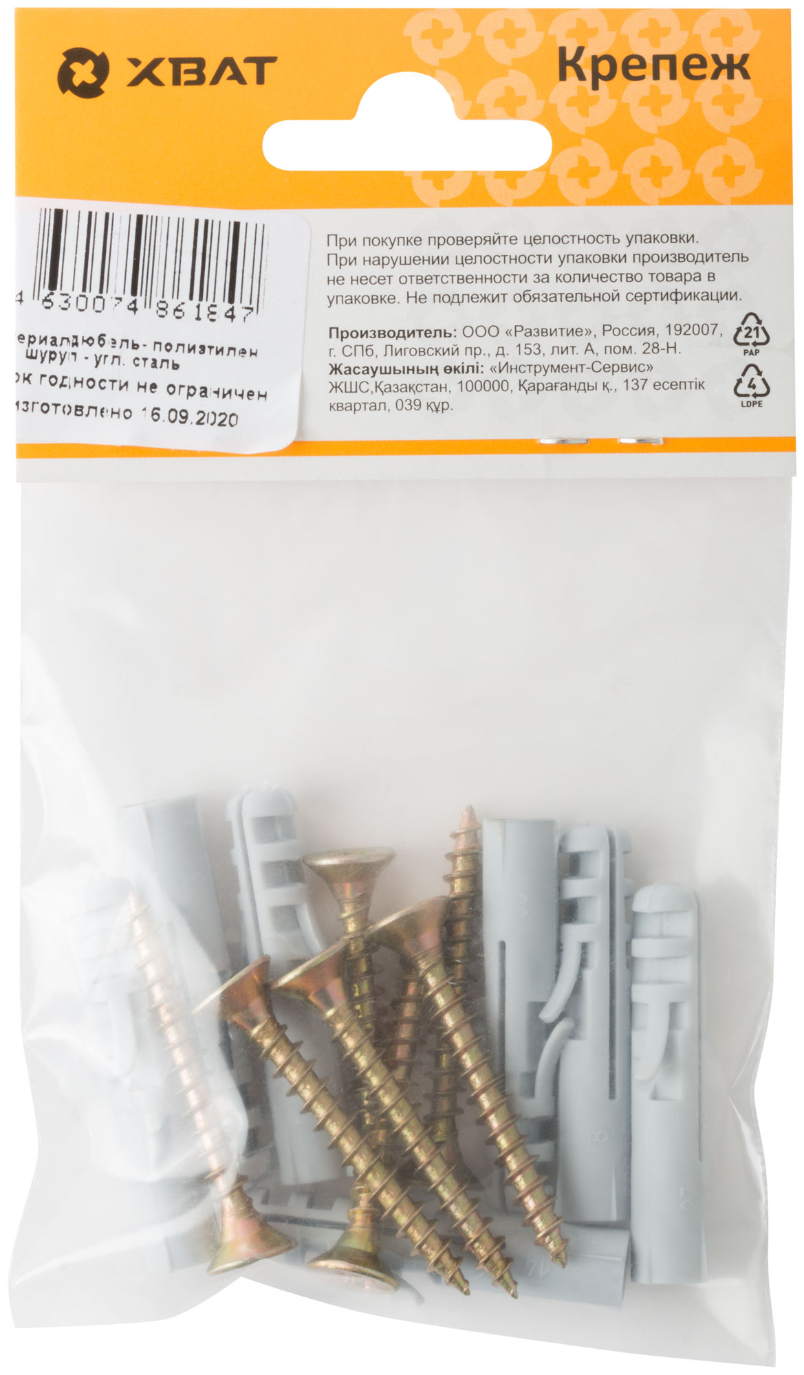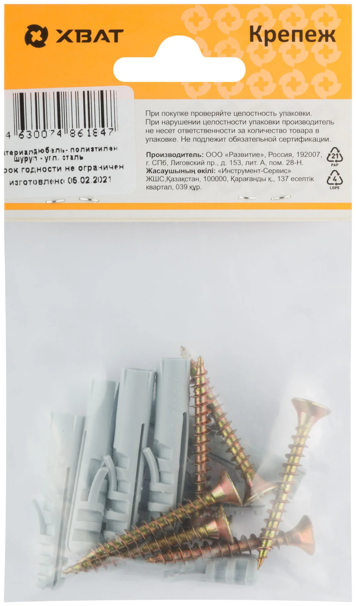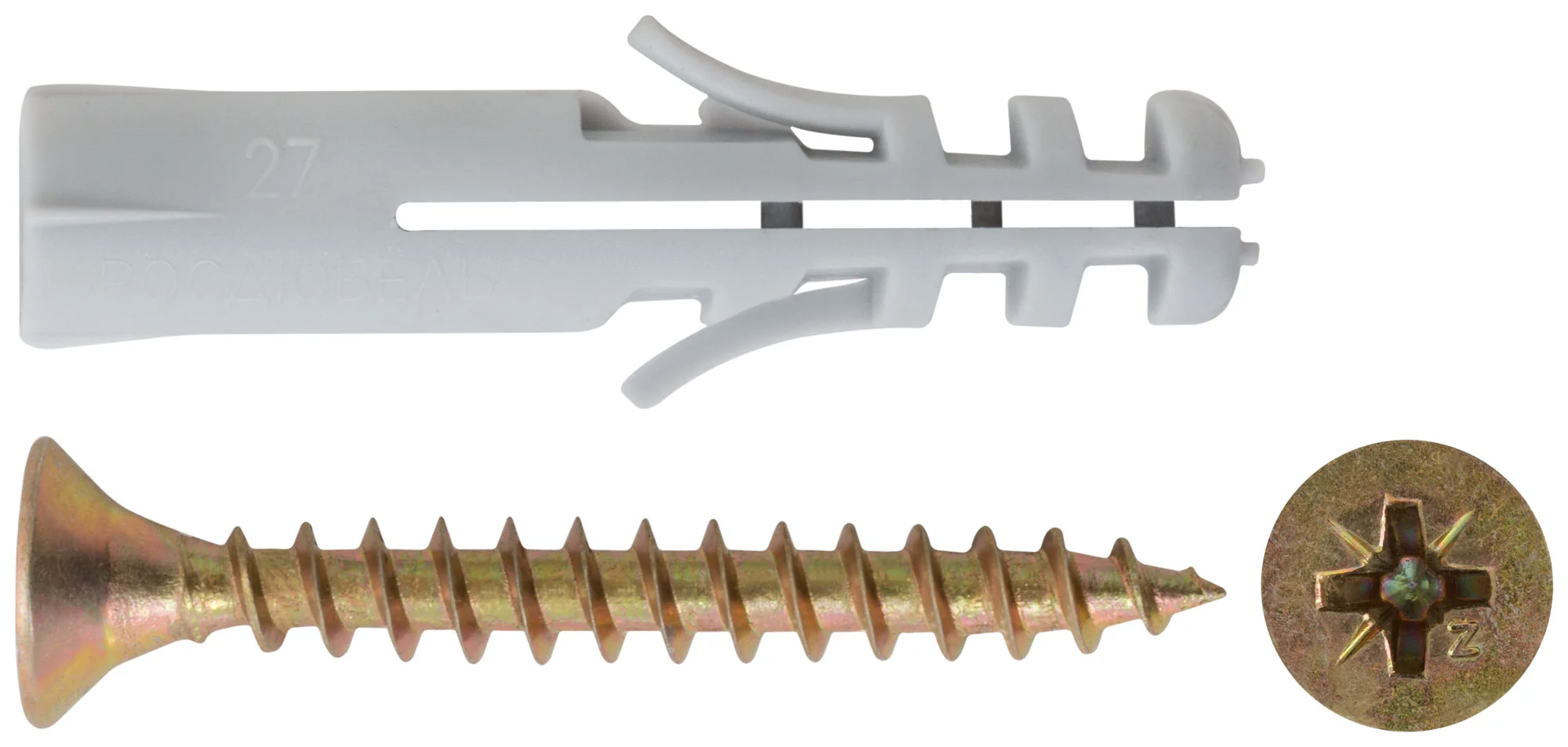 Дюбели изготовлены из прочного полипропилена, который обеспечивает надежную фиксацию, а шурупы выполнены из стали, гарантируя долговечность и устойчивость конструкции. Фасовка из 7 штук позволяет удобно использовать комплект в небольших или масштабных проектах.