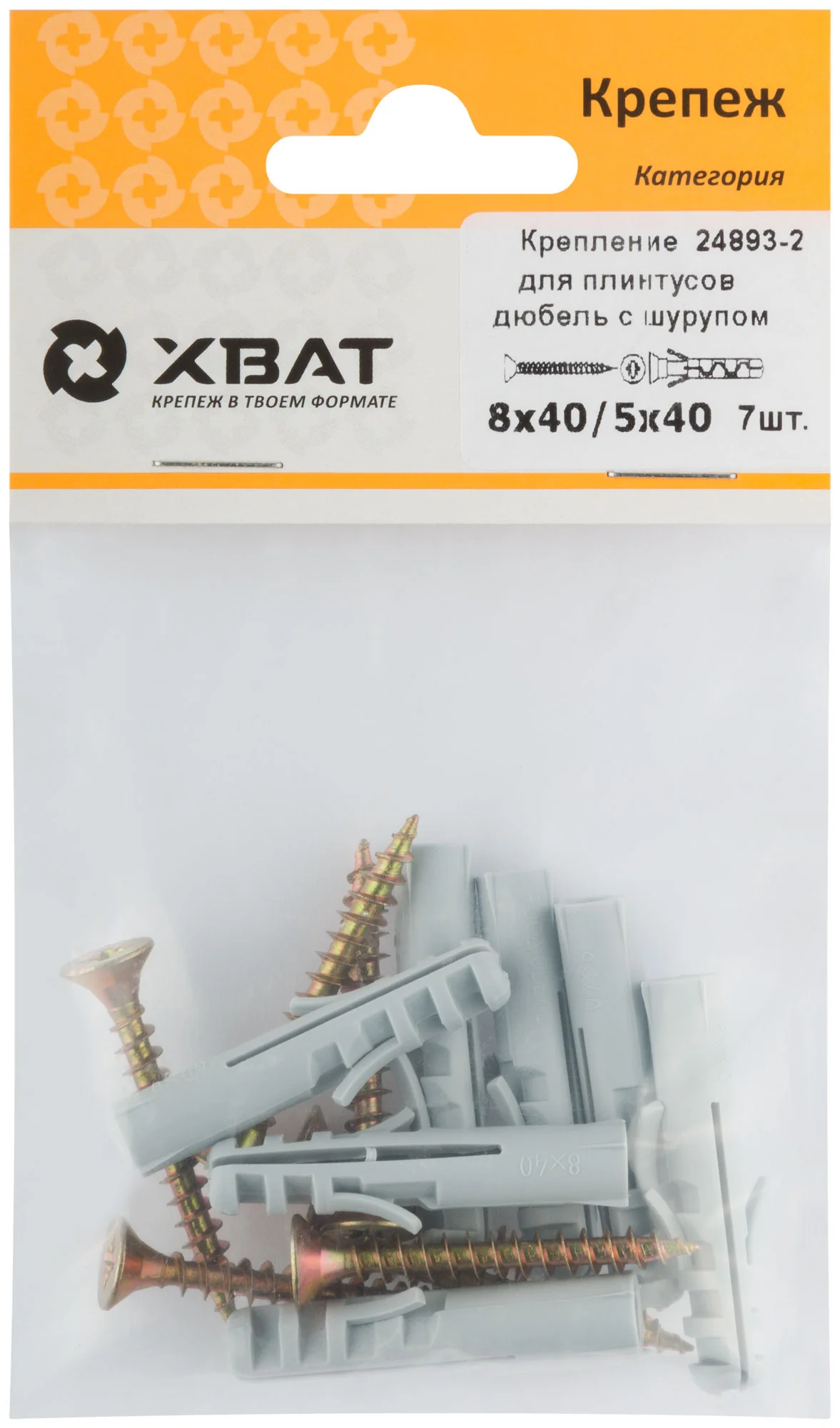 Этот комплект креплений включает в себя дюбели и шурупы размером 8х40 и 5х40 мм, идеально подходящие для установки плинтусов. Незаменим в ситуациях, когда требуется быстро и надежно закрепить плинтус на стене или полу.