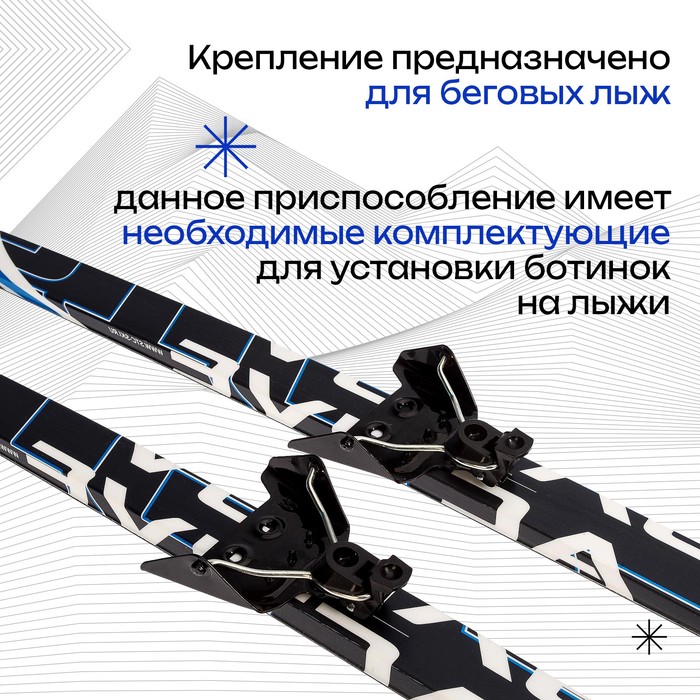 Крепление предназначено для беговых лыж. Данное приспособление имеет все необходимые комплектующие для установки ботинок на лыжи.
