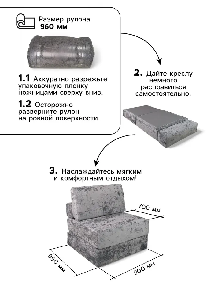 - Стильный внешний вид: серый цвет и лаконичный дизайн делают кресло-кровать универсальным дополнением к любому интерьеру.