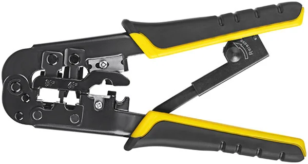 Храповый механизм блокирует обратный ход обжимной матрицы, защищая от слабой опрессовки. Встроенные лезвия позволяют разрезать и снимать изоляцию с различных типов кабелей, а специальная скоба защищает пальцы от случайных порезов.