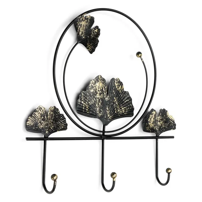Обладают всеми необходимыми качествами для удобного хранения одежды и аксессуаров. На вешалке можно разместить головные уборы, шарфы или свои любимые предметы. Удобное дополнение, которое поможет вам организовать пространство и добавить характер вашему интерьеру. Каркас изготовлен из металла, что делает фурнитуру долговечной и прочной, способной выдерживать значительную нагрузку. Настенная вешалка имеет красивые вставки в виде листочков. Покрашена в элегантный чёрный цвет с напылением золотого цвета.