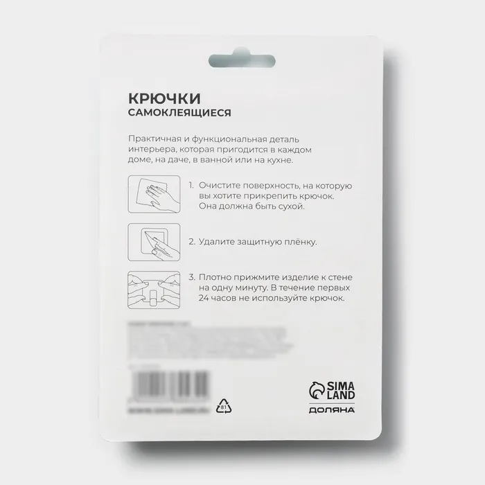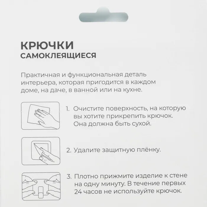 Очистите поверхность, на которую вы хотите прикрепить крючок. Она должна быть сухой.Удалите защитную плёнку с оборотной стороны крючка.Приклейте крючок на сухую, очищенную поверхность. Плотно прижмите изделие и удерживайте в течение минуты.Не используйте крючок первые 24 часа после установки.