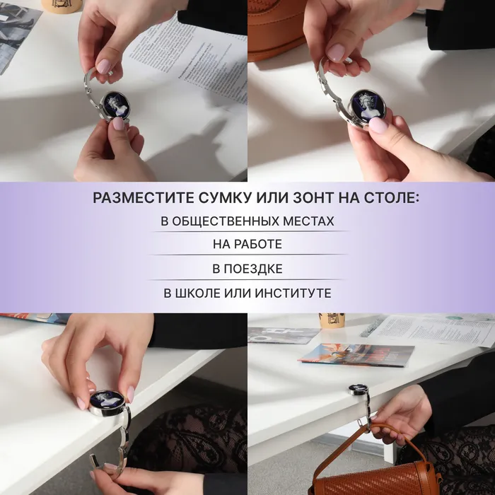 Держатель для сумок и зонтов — незаменимый помощник при посещении кафе, ресторана, офиса или любого другого места. Этот стильный крючок легко фиксируется на любой плоской поверхности. Больше не нужно искать, куда положить сумочку, ведь она всегда будет висеть рядом на крючке, который аккуратно держится за край стола.