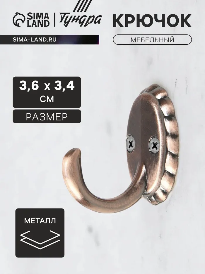 Крючок мебельный ТУНДРА TKO018, однорожковый, медь