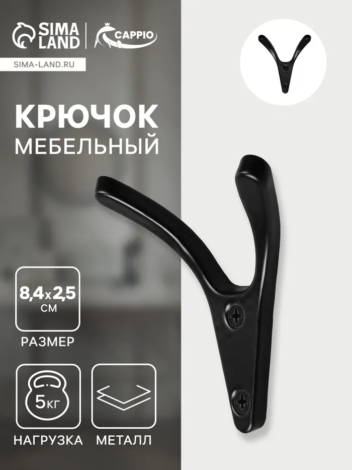 Крючок мебельный ТУНДРА TKd=008, двухрожковый, черный