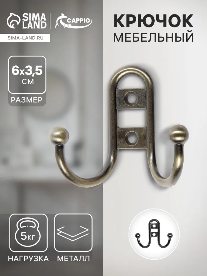 Крючок мебельный ТУНДРА TKd=007, двухрожковый, бронза