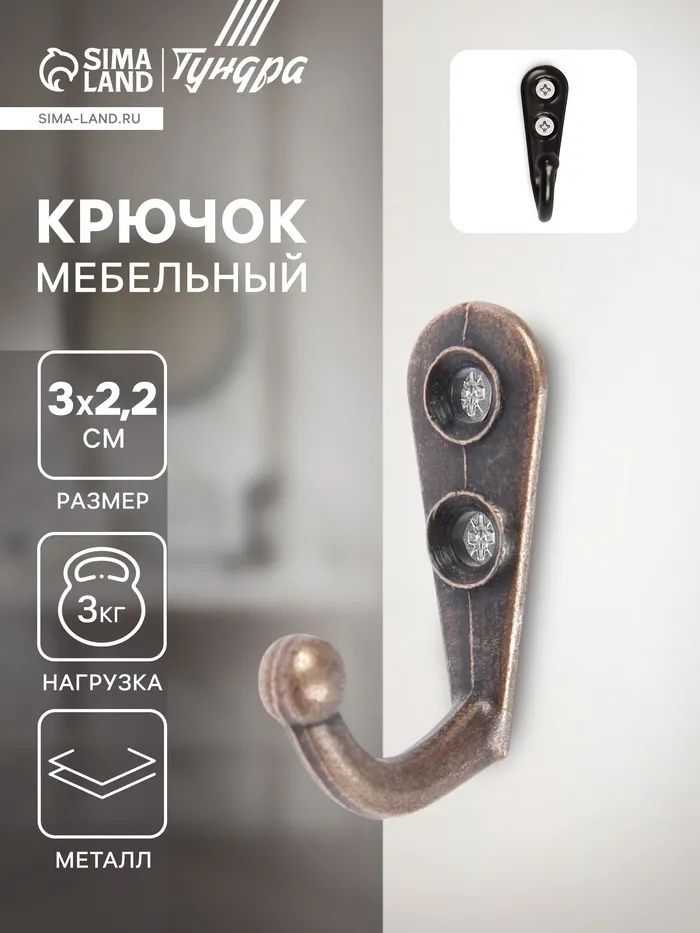 Крючок мебельный ТУНДРА TKO001, однорожковый, медь, 1000 шт. — Характеристики