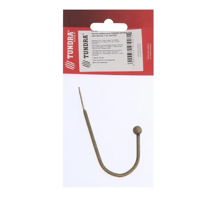 Крючок мебельный ТУНДРА TKO003, однорожковый, бронза — Характеристики