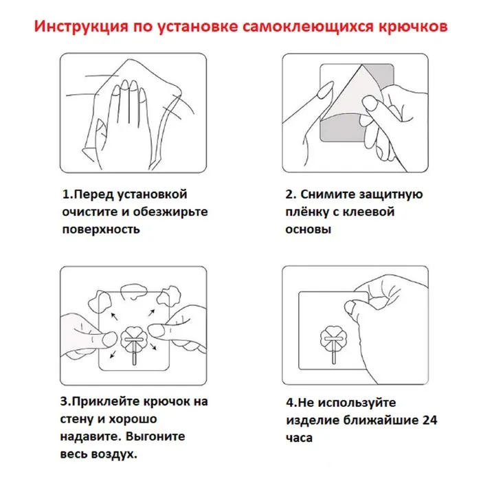 Очистите поверхность, на которую вы хотите прикрепить крючок. Она должна быть сухой.Удалите защитную плёнку с оборотной стороны крючка.Приклейте крючок на сухую, очищенную поверхность. Плотно прижмите изделие и удерживайте в течение минуты.Не используйте крючок первые 24 часа после установки.